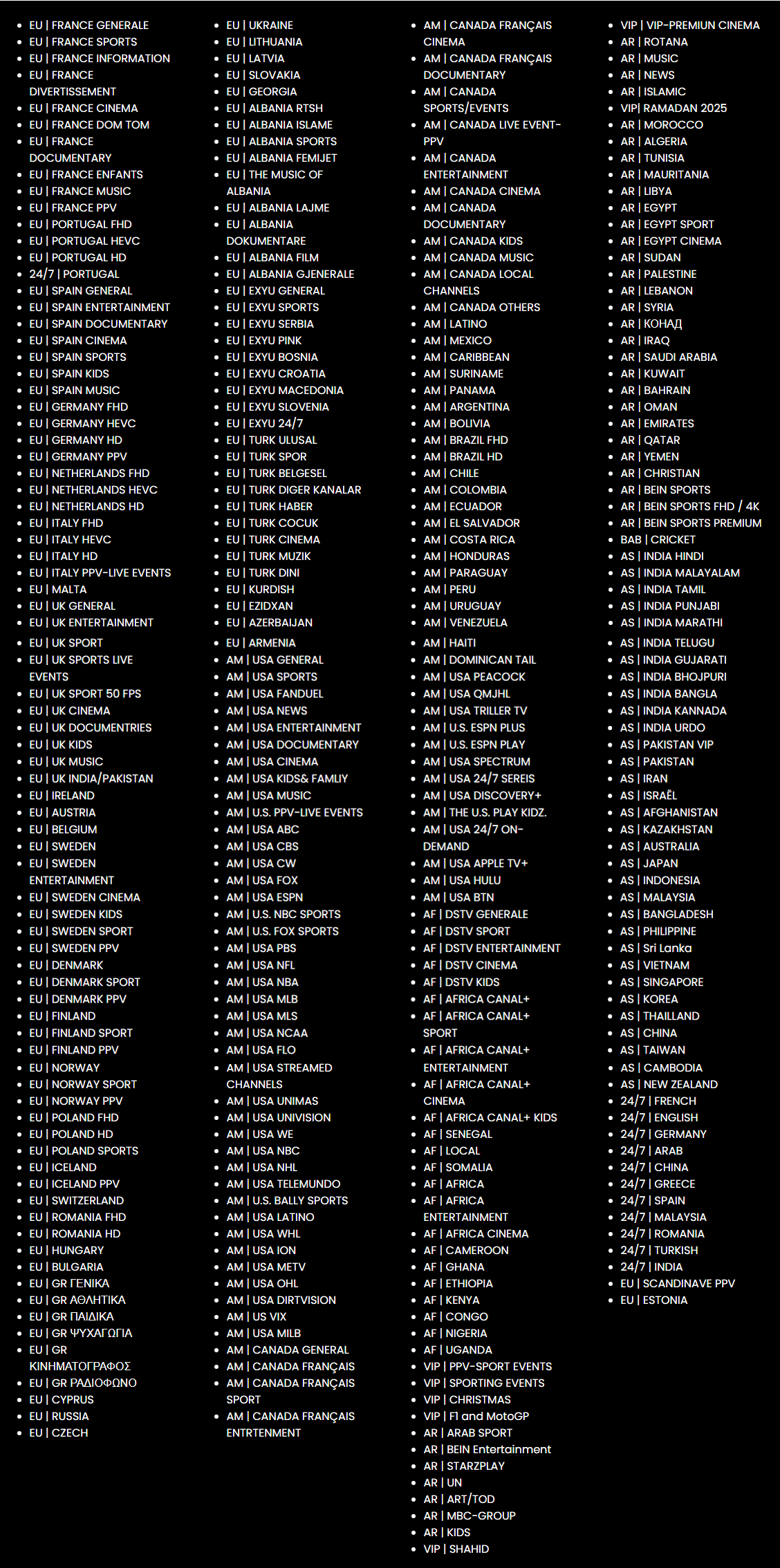 International Channels: Coverage from the USA, UK, Canada, Europe, Asia, Africa, India, and Arabic regions.