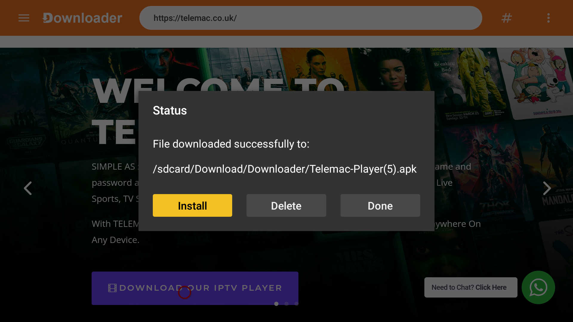 9. Downloader will install the latest Telemac IPTV Player APK onto your FireStick.